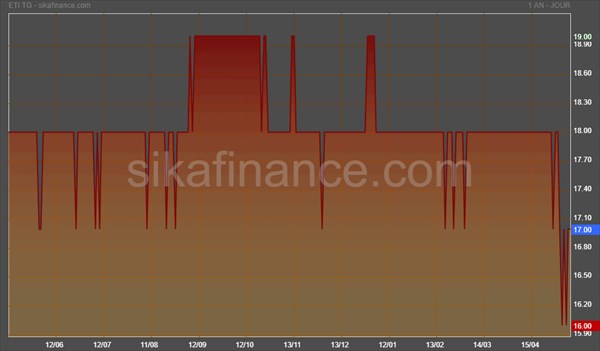 Sur les 12 derniers mois, l'action a affiché une évolution stable avec pour support 17 FCFA et résistance 19 FCFA. A l'annonce des performances financières annuelles, le titre s'est replié à 16 FCFA, témoignant d'une perte de confiance des investisseurs.
