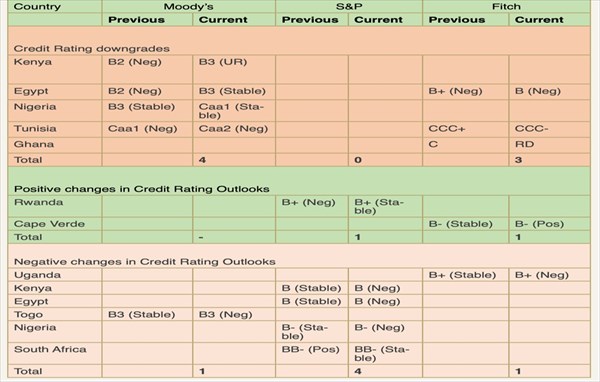 Au premier semestre 2023, le "Big Three" de la notation financière mondiale a abaissé la note du Ghana, du Nigeria, du Kenya, de l'Égypte et du Maroc, invoquant à chaque fois les besoins croissants de financement du gouvernement, des pressions liées aux prochaines échéances sur leurs euro-obligations, l'affaiblissement de la position de liquidité extérieure en raison d'une trajectoire de change défavorable. Cependant, le Nigeria, le Kenya et le Ghana ont rejeté l'abaissement de leur note invoquant un manque de compréhension de l'environnement national par les agences de notation.