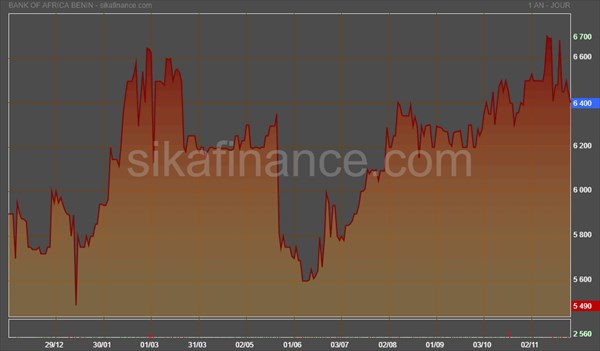 Conformément à la tendance générale des valeurs BOA de la BRVM, l'action de BOA Bénin affiche une dynamique haussière, enregistrant un gain de 7,56% à un prix de 6 400 FCFA à la clôture de la séance du 28 novembre 2023. Au cours de cette période, l'action a connu une forte volatilité, atteignant un plus bas d'un an à 5 490 FCFA à la mi-janvier, pour ensuite évoluer dans un canal haussier jusqu'à atteindre son plus haut d'un an à 6 700 FCFA.