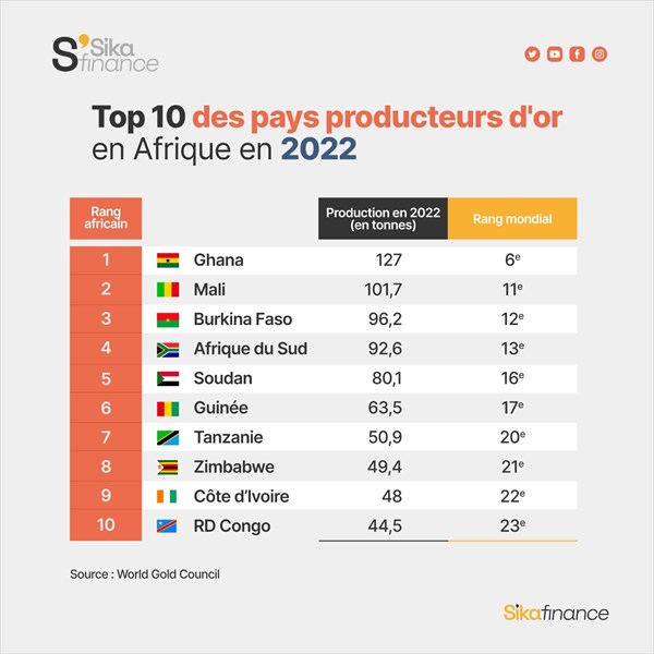 D'après le classement du top 10 des pays producteurs d'or en Afrique dressé par Sika finance, il ressort que le Ghana, pays d'Afrique de l'Ouest, est le premier producteur d'or du continent et occupe le 6ème rang mondial, avec une production qui a atteint 127 tonnes.