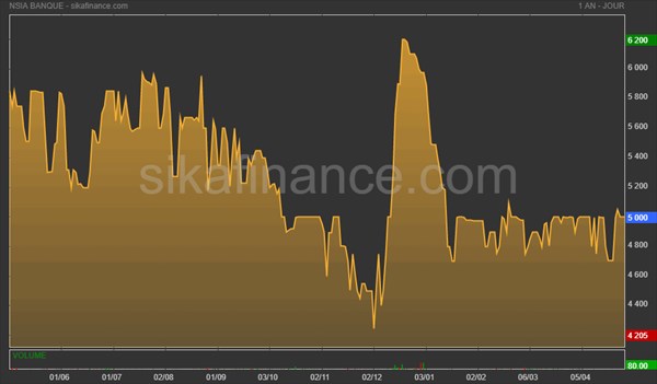 Depuis le début de l'année, le titre est dans un cycle baissier avec une décélération de 16,32%, en dépit de ses bonnes performances. A la clôture du vendredi 28 avril 2023, le cours se situait à 5 000 FCFA contre 5 975 FCFA à fin 2022.
