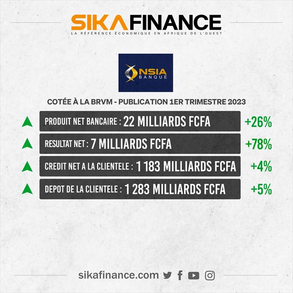 Selon les informations succinctes publiées par la banque, la maitrise rigoureuse des charges a permis au résultat net de NSIA Banque CI de ressortir à 6,56 milliards FCFA, soit une progression fulgurante de 78% comparativement à fin mars 2022. En outre, les encours de crédits se sont accrus de 4% à 1 183 milliards FCFA en lien avec l'augmentation des nouveaux financements pour ce trimestre. Quant aux encours de dépôts, ils se sont majorés de 5% à 1 283 milliards FCFA grâce à la hausse des dépôts à vue et dépôts à terme.