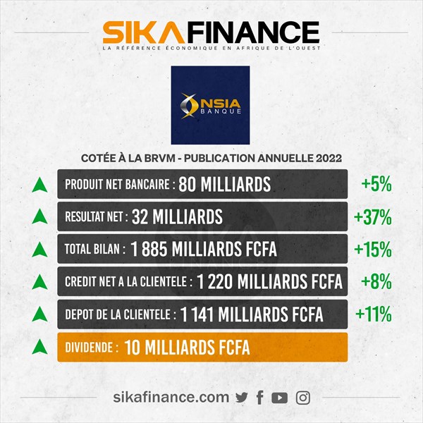 Les actionnaires de la Banque se féliciteront des belles performances réalisées ces dernières années. En effet, NSIA Banque proposera le paiement d'un dividende brut de 10 milliards FCFA à ses actionnaires pour le compte de l'exercice 2022, selon nos sources.
