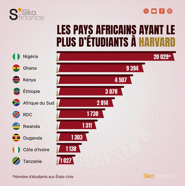 L'Ouganda, la Côte d'Ivoire et la Tanzanie ferme le classement avec respectivement 1 303 ; 1 138 et 1 027 étudiants internationaux inscrits dans les filières de Harvard.