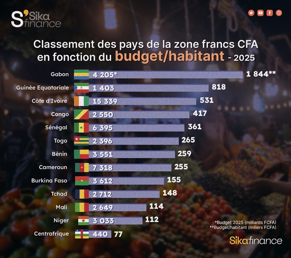 En rapportant ce budget à la taille de la population, il apparaît que certains pays, bien que consacrant des ressources financières importantes, se retrouvent parfois avec des allocations par habitant relativement faibles. De manière théorique, Sika finance met en évidence les pays d'Afrique de l'Ouest avec les budgets publics les plus élevés par habitant en 2025.