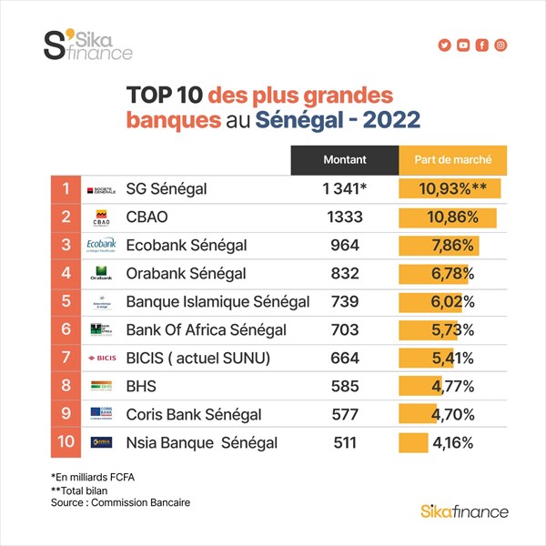 La Société Générale du Sénégal reprend la tête de la plus grande banque au Sénégal en termes de Total bilan (1 341 milliards FCFA), devant sa rivale marocaine CBAO 2ème qui perd sa couronne (1 333 milliards FCFA) et des deux banques togolaises, en l'occurrence ECOBANK Sénégal intact à la 3ème place (964 milliards FCFA) et ORABANK 4ème (832 milliards FCFA).