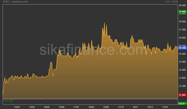 Au cours de l'année 2023, l'action société générale a cumulé une plus-value de 38,30% avec un cours se hissant à 16 050 FCFA, soit son plus haut niveau jamais atteint depuis 2016. Il convient également de rappeler qu'à la mi-septembre, le titre atteignait son plus important pic à 18 000 FCFA, ce qui avait occasionné d'importantes prises de profits, faisant reculer le cours de l'action.