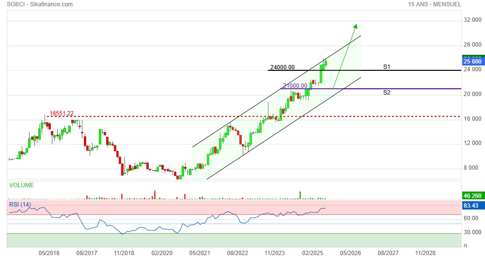 Le titre SGCI demeure solidement ancré dans une tendance haussière robuste, portée à la fois par des fondamentaux financiers solides et par la confiance renforcée des investisseurs. Sur le plan technique, l'indice RSI (14) à 83,43 place la valeur en zone de surachat, traduisant un risque accru de correction à court terme. Néanmoins, dans un contexte de marché fortement orienté à la hausse, ce signal pourrait davantage annoncer une phase de consolidation horizontale qu'un véritable retournement, avant l'émergence d'une nouvelle impulsion haussière.