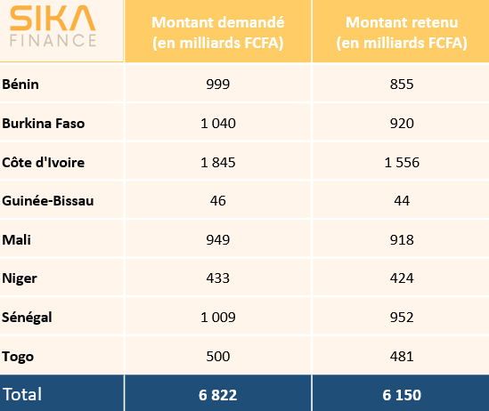 En revanche, les banques ont formulé une demande de liquidité de 6 821,86 milliards FCFA, supérieure de 671,86 milliards FCFA au montant mis en adjudication.