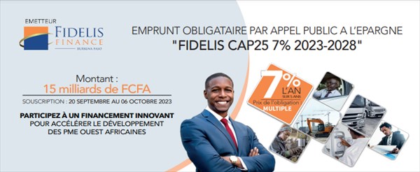 Pour sa première émission obligataire sur le marché financier régional de l'UMOA, Fidelis Finance Burkina Faso, établissement financier à caractère bancaire, souhaite mobiliser une enveloppe de 15 milliards FCFA, soit 22,87 millions d'euros, pour "financer son plan de développement régional à travers un pipeline de projets identifiés et rentables dans ses pays de présence (Burkina Faso et Côte d'Ivoire)".