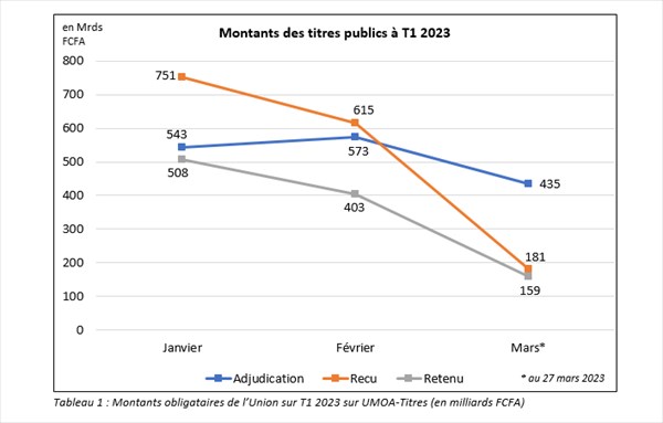 Montants obligataires de l'Union sur T1 2023 sur UMOA-Titres (en milliards FCFA)