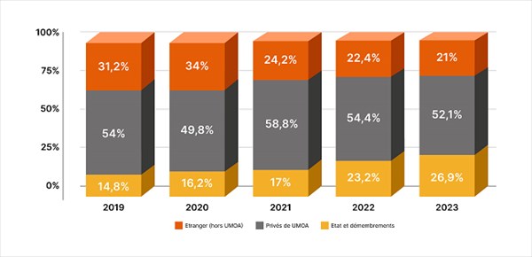 En effet, avec la plus grande part dans le capital de ces établissements, les acteurs privés de l'UMOA (personnes physiques et morales ressortissantes de l'UMOA) ont vu leur capital augmenter en moyenne de 13,6% sur cinq ans, atteignant 1 243,2 milliards FCFA en 2023, contre 1 094,2 milliards de FCFA en 2019. Cette hausse est attribuable, entre autres, aux opérations d'acquisitions ou de création d'établissements de crédit par des opérateurs économiques nationaux.