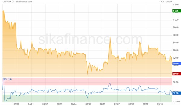 La forte volatilité du cours depuis le début de l'année assujettit l'action à la spéculation. Au 2 octobre, le cours de l'action s'établissait à 650 FCFA, en baisse de 15,58% comparativement à son niveau du 1er janvier. Cette évolution s'explique par le regard du marché sur les performances financières de la société.